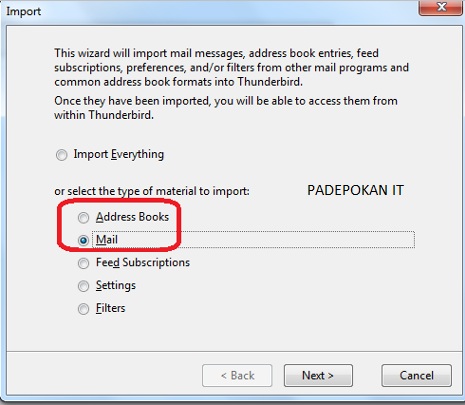 berikut (Pilih Mail untuk mengimport seluruh email)